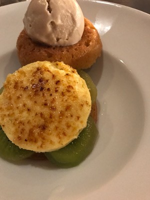 From our table, we could see Ludovic and his team create our meal in the open kitchen. I chose the escalope of foie gras, served with pumpkin puree and a fresh pumpkin chutney, filet of bass with crayfish and slices of steamed leeks, leek puree and pureed potatoes (which had been siphoned into the cutest little lidded dish) and exotic fruit burger (see photos).